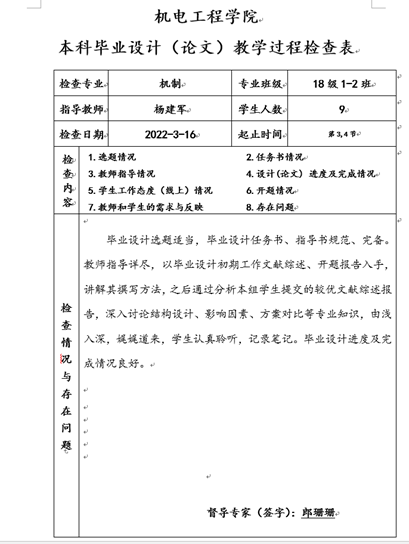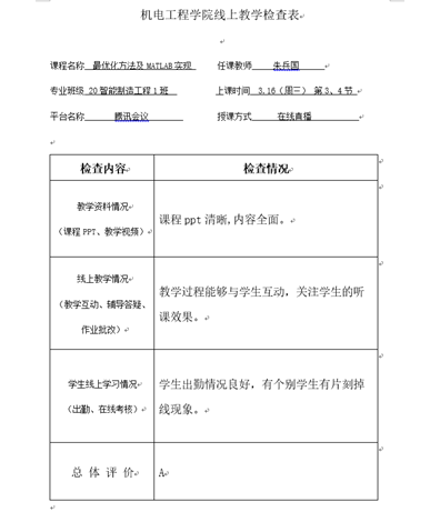 为了切实保障疫情期间线上教学和毕业设计质量线上线下实质等效。学院制定了《机电工程学院线上教学督导方案》,教学督导采取以教学院长彭斌为主的院领导随机抽查,院教学督导专家重点检查的方式,实现教学督导全覆盖。学院王正民书记、张轶副书记随机进入课堂检查学生出勤情况,掌握学生上课动态,以便于营造更加良好的课堂秩序和气氛。