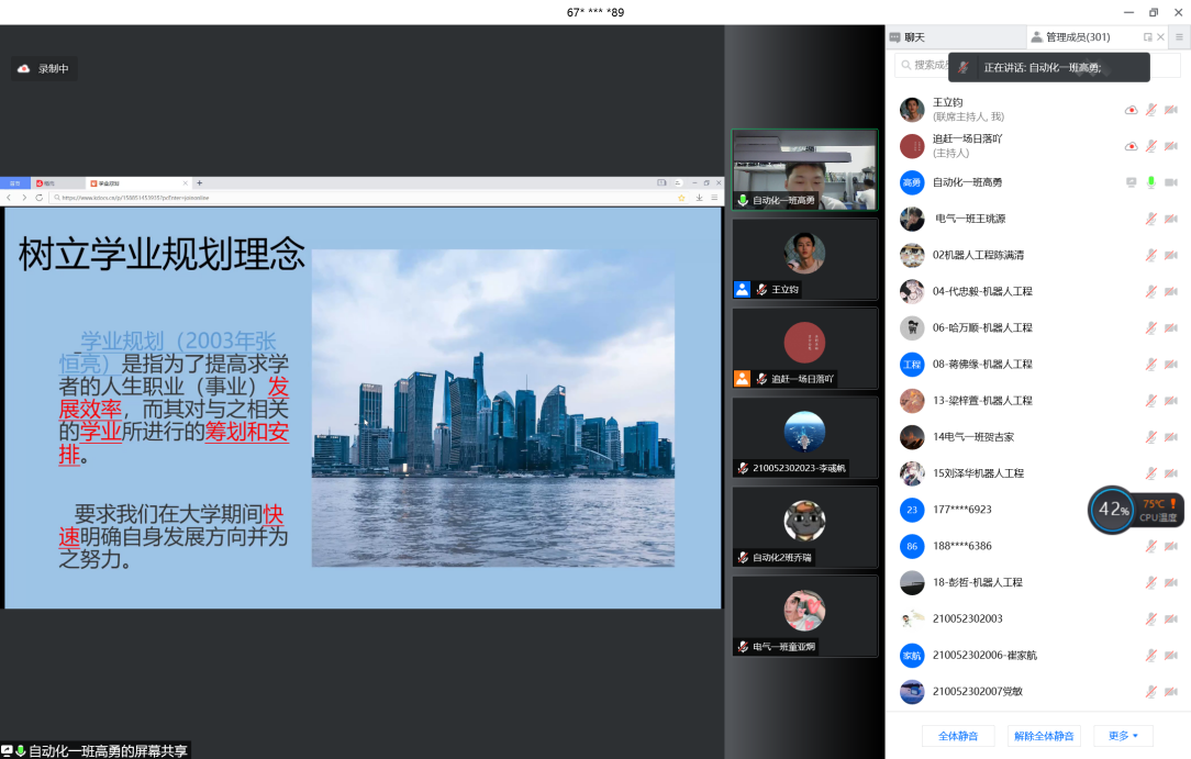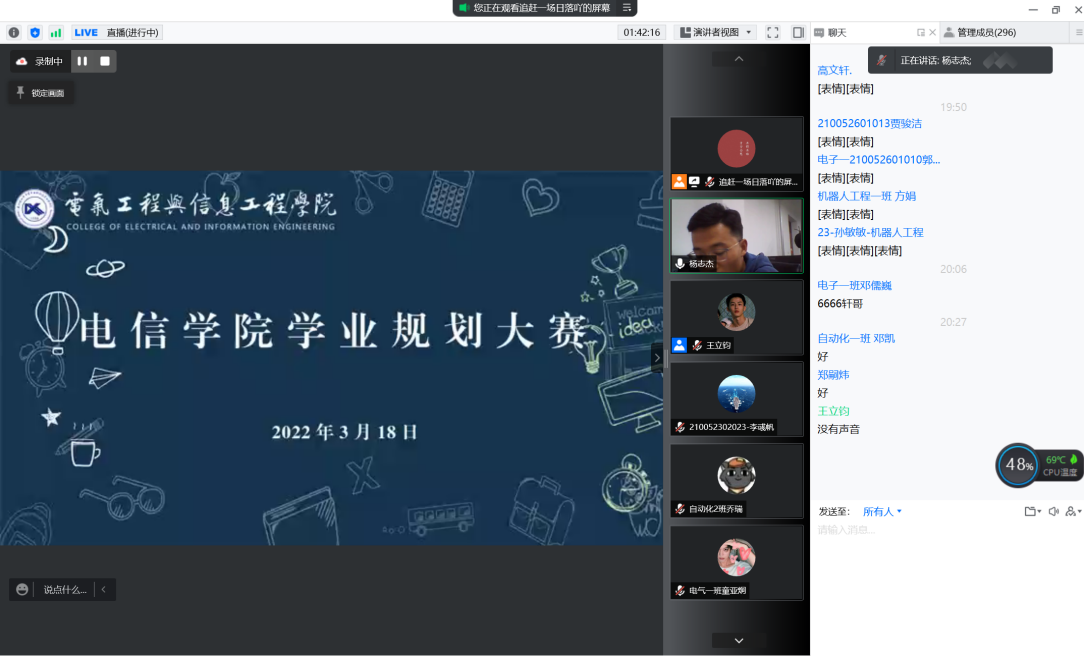 通过举办“青春由我,筑梦未来”学业规划大赛,不仅在学院内营造了积极向上、奋发有为的学习氛围,改善了学生的思想状态,同时丰富了同学们的疫情文化生活,锻炼了同学们的口才,增强了同学们的自信,为推进疫情期间的线上学习工作打下了坚实的基础。(撰稿:王洁;终审:王玲)