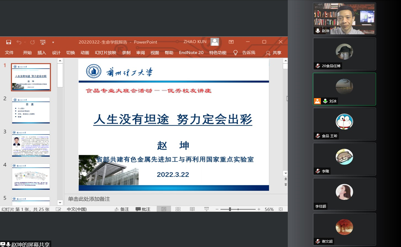 疫情防控期间,为激励广大青年学子坚定理想信念、珍惜大学时光,自强不息、奋发拼搏,3月22日晚,生命科学与工程学院食品科学与工程专业19级、20级和21级同学们通过腾讯视频会议开展“大班会”活动。本次活动邀请食品专业优秀校友、我校省部共建有色金属先进加工与再利用国家重点实验室赵坤博士,为同学们带来“人生没有坦途努力定会出彩”主题讲座。生命科学与工程学院副院长任海伟、19级班主任范文广和20级班主任刘冰参加活动。