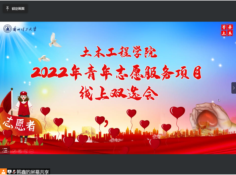 为大力弘扬志愿服务精神,积极践行志愿服务理念,进一步发掘优秀志愿服务项目,推动我校志愿服务项目化运作、社会化动员和制度化发展。土木工程学院团委学生会根据校团委安排,3月23日召开线上2022年青年志愿服务项目“双选会”土木学院分会,为广大同学参与志愿服务搭建平台,遴选优秀工作人员。