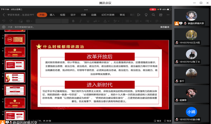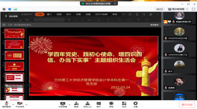 为进一步推进党史教育的学习,让支部党员同志在学党史中不忘初心,践行初心。2022年3月23日,经济管理学院会计学本科生第一支部线上举行了以“学百年党史、践初心使命、增四识四信、办当下实事”为专题的组织生活会集中学习。