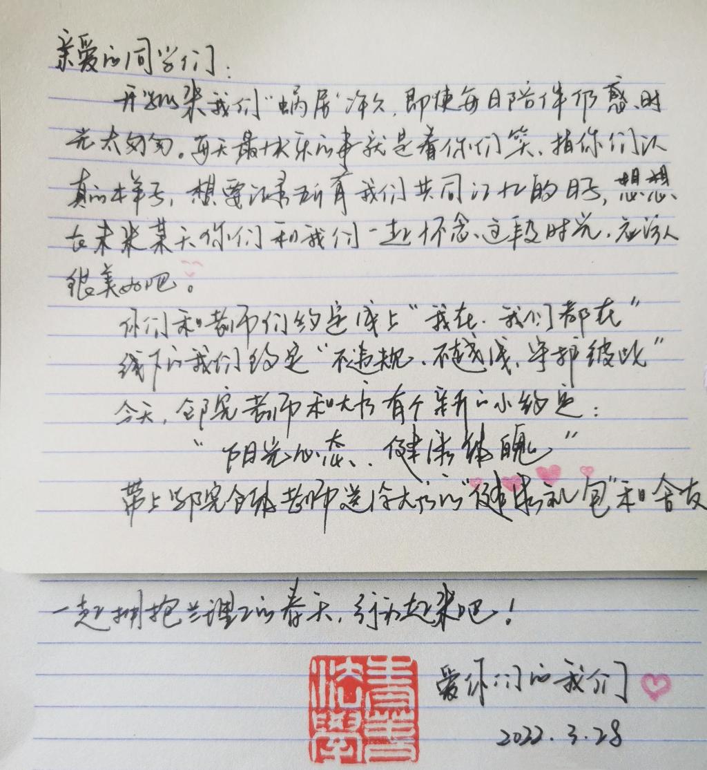 法学院心系每一个学生的健康、平安,定期安排暖心慰问活动,及时为学生送达学校的抗疫“暖心礼包”,并在3月29日为法学院全体同学送去学院的“健康运动器材礼包”,鼓励同学们实施伙伴计划,和同宿舍的同学在跳绳、踢毽子、打沙包这些能够保持安全距离的运动中拥抱美好的兰理工春天。法学院院长贾小龙带队、学院书记张艳代表学院全体老师起草了对同学们的慰问信、辅导员老师、学生党员志愿者为彭家坪校区法学院全体学生送“健康”。暖心的话语、关心的问候,真心的陪伴,同学们纷纷表示有法学院大家庭的温暖与陪伴,全体老师们的关怀和牵挂,战胜疫情的决心与信心更加坚定!(拟稿:焦焱博 审稿:张艳)