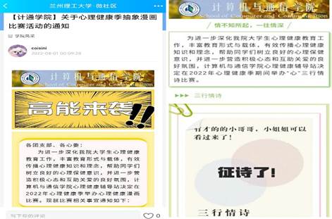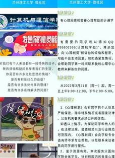 为进一步做好当前疫情防控形势下心理健康教育工作,缓解同学们在封闭管理期间的紧张情绪,近期计通学院在校团委的指导下开展一系列心理健康活动。