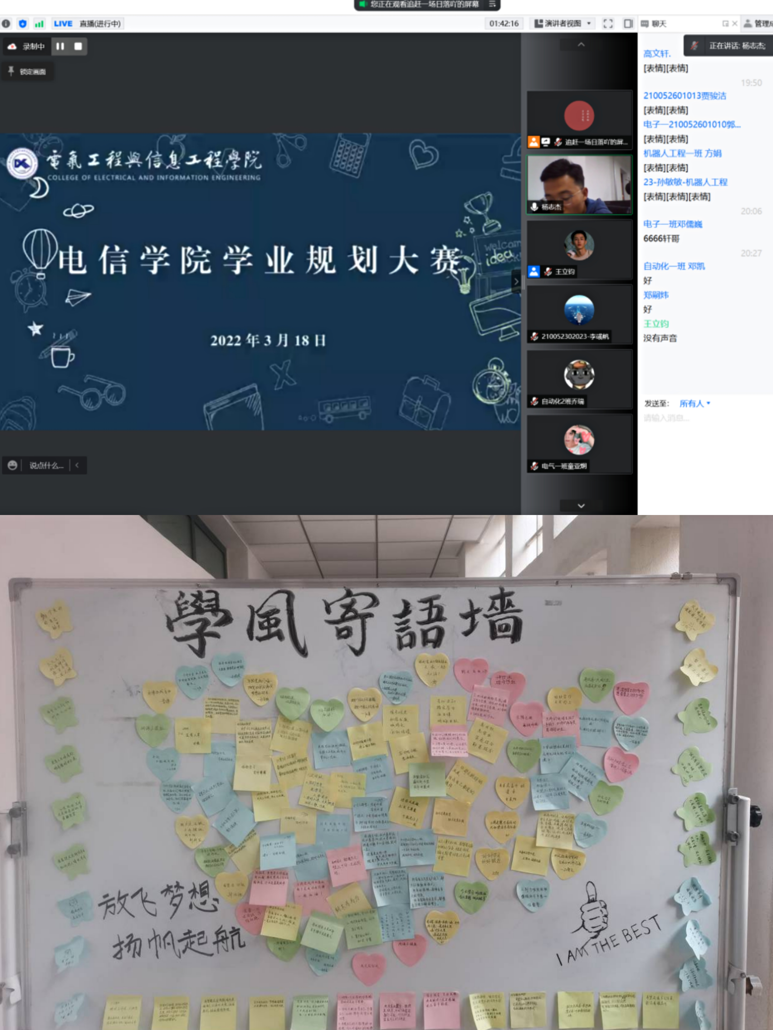疫情期间,宿舍这一方天地承担了更多的职能,为了营造更好的宿舍氛围,电信学院先后开展了“心理树洞”活动,帮助学生解决烦闷、焦虑等负面情绪;开展“尚学有我”2022年学风建设线上系列活动,以学业规划大赛、学习经验交流分享会、“身心我在线”学习打卡积分、“自习不掉线”、“卫生不掉线”、成立学风建设督导小组等方式,帮助学院学生端正学习态度,及时调整线上学习方式,合理制定学习目标和计划,搭建了高低年级交流平台,积极发挥“党团班”一体化纵向网格化管理的优势,凝聚青春力量,彰显尚学风采。