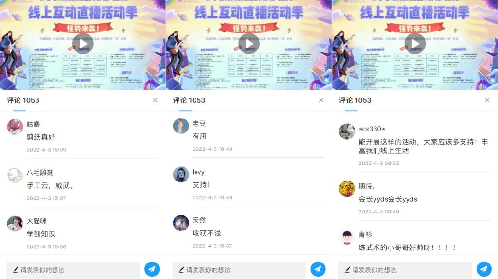 据悉,此次“抗‘疫’云行动”线上互动直播活动将持续至清明假期结束,通过开展每日丰富多彩的直播活动,进一步丰富同学们的居寝生活。(撰稿:伍蕾 审核:王文霞)