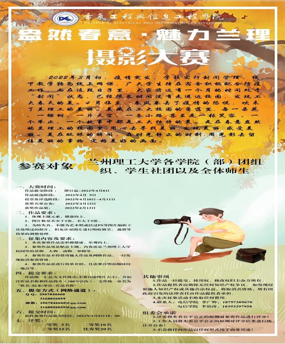 四月已至,一阵春风吹来了兰理工的春色,美藏在工大校园的角落里,每一朵花、一棵树、一片天空、一条小路,甚至是一张笑容、一个举止、一个故事中都是工大独特的美,值此春景,电信学院积极组织开展“盎然春意,魅力兰理”校园春景摄影大赛,鼓励同学们走出宿舍,拥抱自然,热爱生活。