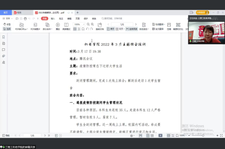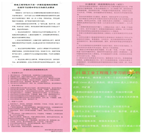 严明纪律要求,落细日常管理。学院坚持线上管理和线下管理相结合、坚持“教育”和“惩戒”并重的方式落实落细学生日常思想、学习、生活。通过主题党、团日活动、主题班会要求学生严格遵守学校疫情防控规定,做好个人防护,认真落实请销假制度,严格执行“日报告、零报告”制度。在疫情防控期间,狠抓学生宿舍阵地,在学风建设、宿舍文明、习惯养成等着力:制定在线学习学生行为规范,严格执行课堂考勤考勤;推动本科生各班级制定班级公约、宿舍公约,培养学生自律意识及自我管理能力;在21级推行“云自习”,帮助学生养成良好学习习惯;以宿舍文化建设、创意作品征集、最美笔记、作业评选等为主体,开展文明宿舍创建系列活动,丰富同学们在疫情期间的课余生活。与此同时,学院对疫情防控措施的各环节、全过程进行严格的督导检查,杜绝谎报、瞒报、漏报个人疫情防控相关信息的情况出现,对翻墙出校、逃课等违纪违规的学生严肃处理并开展警示教育,进一步严明疫情防控各项要求。