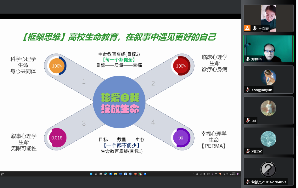 4月4日下午郑林科教授做《大学生抗疫生命关照-在叙事中遇见更好的自己》的生命教育主题讲座,郑老师围绕“重建自我”、“疗愈自我”、“快乐自我”等十二个部分,告诉大家如何用叙事心理学的方法理解疫情,关照生命,遇见更好的自己,带领大家用更加积极和多元的视角对焦虑、恐惧、抑郁等进行了解构和重建,引导大家用更加积极和乐观的视角看待问题,看待疫情,学会为自己赋能,让自己的生命变得更加美好。期间还带领全体参会师生进行“善爱我宣誓”体会积极生命教育的力量。