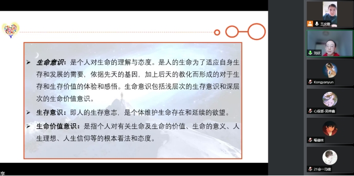 两位老师的讲座内容丰富、扎实,形式多样,通过讲座加深了同学们对生命的认识和体会,促进了同学们形成正确的生命观,学会用更加积极和多元的视角看待疫情、看待生命,学会敬畏生命、珍爱生命,让自己变得更加美好、让自己的生命如花绽放!