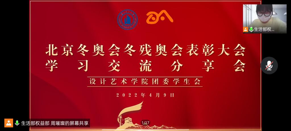 北京冬奥会冬残奥会表彰大会于2022年4月8日举行,为深入学习弘扬胸怀大局、自信开放,迎难上、追求卓越、共创未来的冬奥精神,设计艺术学院在线上开展北京冬奥会冬残奥会表彰大会学习交流分享会,学院团委学生会全体学生工作人员参与此次学习。