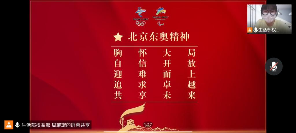 本次活动以北京冬奥精神为主题,首先由周璀璨带领全体同学学习“胸怀大局、自信开放、迎难而上、追求卓越、共享未来”北京冬奥精神,就习近平总书记指出的冬奥精神进行解读,并引用习近平总书记的讲话,指出冬奥的意义在于:确保北京冬奥会、冬残奥会如期安全顺利举办,确保“两个奥运”同样精彩,是中国人民向国际社会做出的庄严承诺;两奥会成功举办,促进了不同文明交流互鉴,为推动全球团结合作、共克时艰发挥了重要作用,也为动荡不安的世界带来了信心和希望,向世界发出了“一起向未来”的时代强音;事实充分证明,中国共产党是我们成就伟业最可靠的主心骨,只要始终不渝坚持党的领导,就一定能够战胜前进道路上的任何艰难险阻,就一定能够办成我们想办的任何事情;我国社会主义制度非凡的组织动员能力、统筹协调能力、贯彻执行能力,我国坚实的经济实力、科技实力、综合国力,为成功办冬奥提供了强有力的底气和最坚实的保障!北京冬奥会、冬残奥会是一场和平友谊的盛会、一场团结合作的盛会、一场鼓舞世界的盛会!