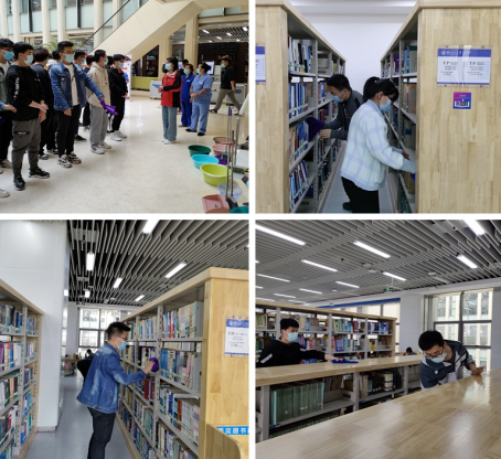 在彭家坪校区图书馆,学院第15期发展对象在图书馆工作人员的组织下,分批进入彭家坪图书馆,协助物业工作人员开展清洁书架、整理桌椅、图书等工作,为在图书馆学习的同学营造了一个干净、整洁、舒适的学习环境。