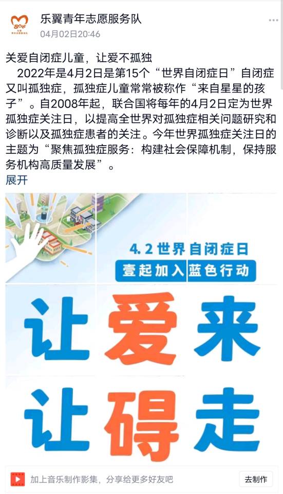2022年4月2日是第15个“世界自闭症日”。4月10日,设计艺术学院乐翼青年志愿服务队在线上举办世界自闭症日活动,呼吁同学们关爱自闭症儿童。