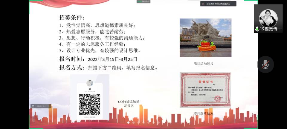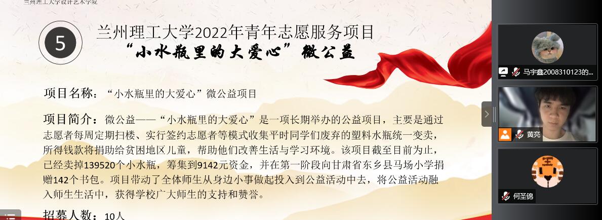 此次双选会,我院共有七个团队进行了申报。分别是:“小水瓶里的大爱心”微公益、“法治文化”针对当代大学生的普法教育志愿服务项目、共益设计——“微景观”营造助力陇上乡村振兴、应急救援与疫情防控志愿服务项目、我为家乡做点事儿——“青藏之眼 雪域明珠”天祝藏区文旅传播者、手绘乡村文化墙志愿服务项目。项目内容具体囊括法律服务、应急救援与疫情防控、乡村振兴、关爱贫困地区儿童、旅游服务及其他领域。双选会活动中,首先由各项志愿服务项目负责人对志愿项目依次进行宣讲,介绍项目背景、招募人数、招募条件、报名时间以及方式等项目内容。其次,主持人组织各项目负责人进行线上答疑环节。最后,学院团委素质拓展部的工作人员为大家再次解读了学校关于青年志愿服务项目大赛的相关注意事项。至此,双选会圆满结束。