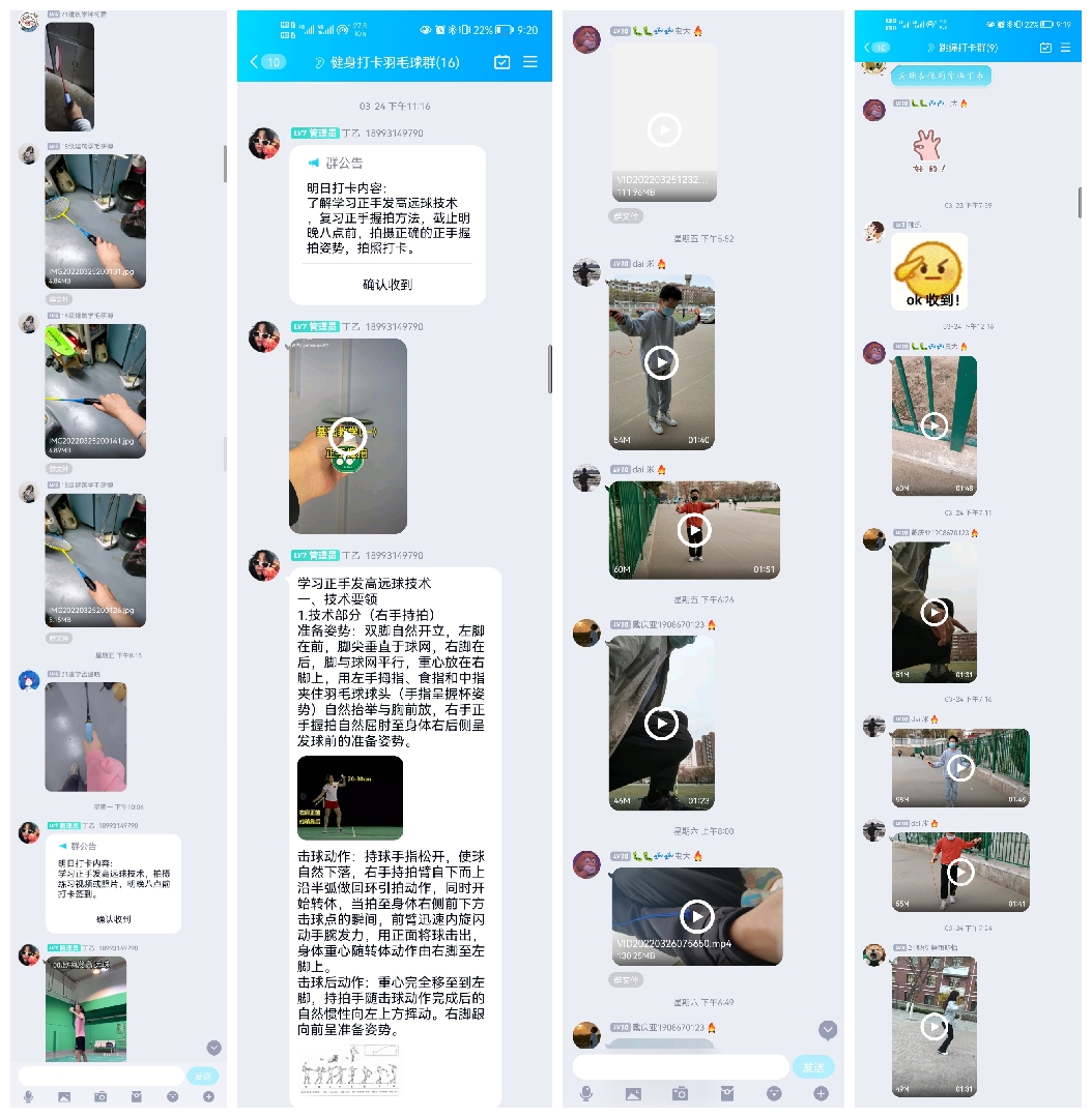 活动采用每日线上打卡监督的形式,帮助同学们养成运动习惯,增强免疫力,吸引了同学们广泛参与。线上运动打卡活动于3月20日正式开始,其中包括跑步、跳绳、羽毛球等五项活动项目。参与活动的同学通过照片、视频、运动app截图等方式在微信群进行每日打卡,并在群里交流运动心得,分享健康运动方式,同学之间互相监督、互相鼓励,从而增强了每日运动的主动性和积极性。每个项目的打卡群内日日消息不断,各式各样的运动打卡展现了兰州理工大学学子们热爱生活、健康向上的精神风貌和青春活力。