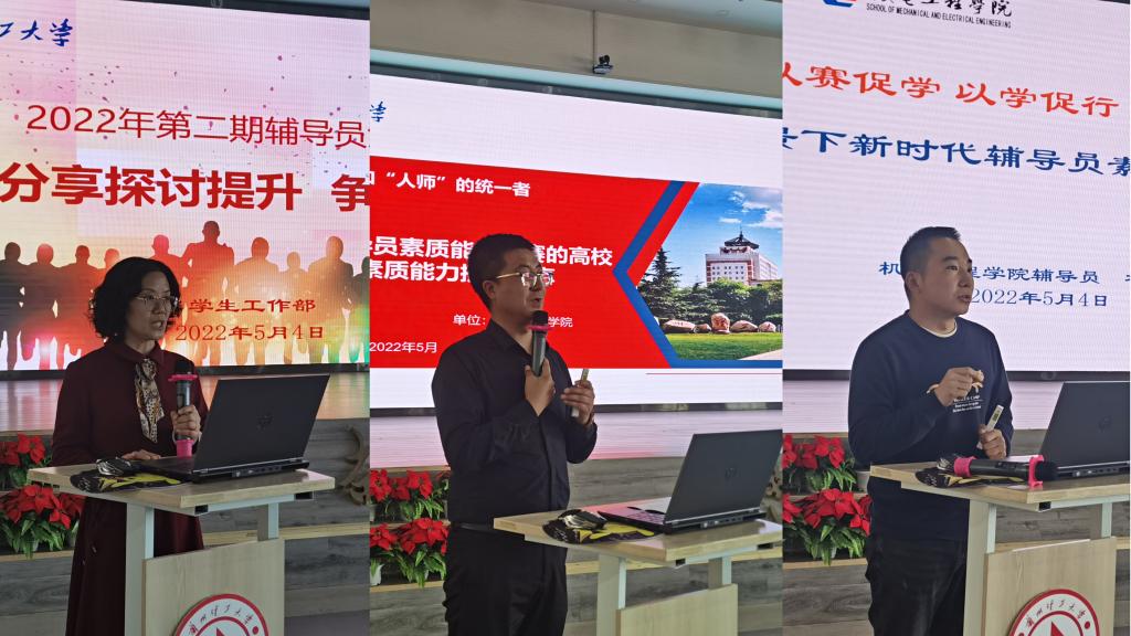 获第九届全国辅导员素质能力大赛甘肃赛区二、三等奖的经管学院辅导员贾永胜和机电学院辅导员冯玉玺,为大家分享了备赛和参赛心得。贾永胜以《努力做“经师”和“人师”的统一者——基于辅导员素质能力大赛的高校辅导员素质能力提升分享》为题,从知学习、懂差距、开思路、增实效四个维度,结合实际工作、辅导员素质能力大赛和辅导员应该具备的背、积、写、讲的能力进行了分享;冯玉玺以《大赛背景下新时代辅导员素质能力提升漫谈》为题,从“谈”赛制、“聊”基础、“话”感受三个方面进行了分享。