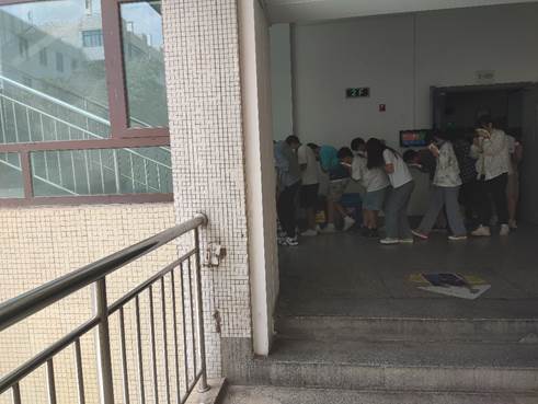 应急疏散中,教官一声令下,所有师生快速、有序地撤离,手捂口鼻,弯腰跟着队伍迅速撤离到安全的位置,整个过程秩序井然,配合默契。