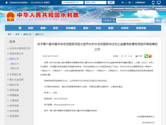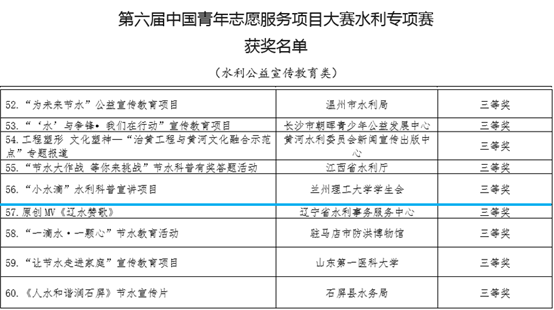 近日,由水利部和共青团中央共同举办的第六届中国青年志愿服务项目大赛节水护水志愿服务与水利公益宣传教育专项赛,现已发布评审结果,我省共有3个项目获奖,其中我校学生会申报的《“小水滴”水利科普宣讲项目》荣获三等奖。