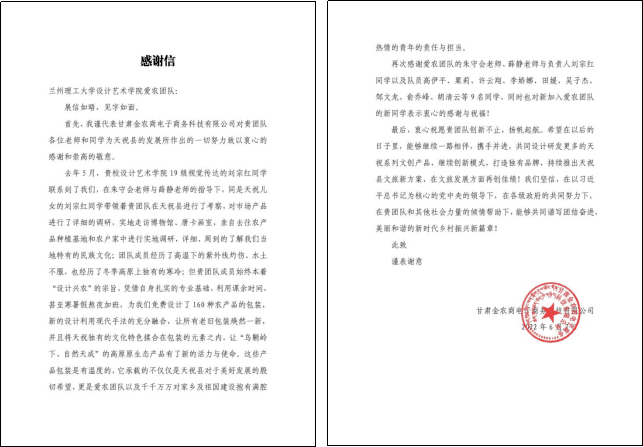 在烈日炎炎的六月,设计艺术学院视觉传达系爱农团队收到一封来自甘肃省金农商电子商务科技有限公司的一封感谢信。信中讲述了一年以来爱农团队为天祝县发展所作出的一系列贡献,表达了深深的感激之情。设计学院爱农团队将所学专业知识利用到实际生活中,充分发扬“奋进求是”的校训精神,克服种种困难,投身乡村振兴事业,为甘肃省武威市天祝藏族自治县的发展添上一臂之力,得到了当地广泛好评,取得良好的社会影响。
