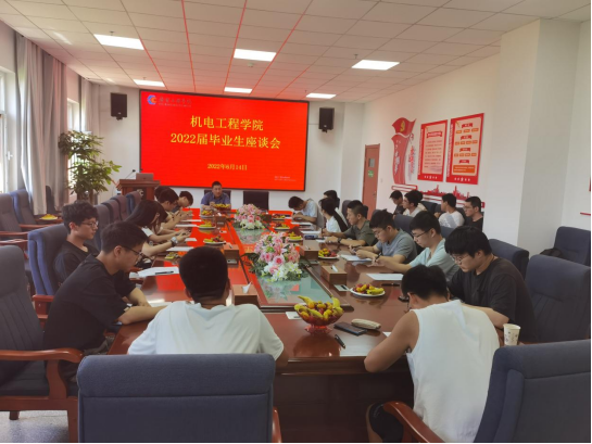 为进一步落实立德树人根本任务,搭建专业教师与学生的交流平台,2022年6月14日,机电工程学院在机电大楼学院会议室举行了2022届毕业生座谈会,主题是分享大学生活心得体会。学院领导、系部主任及20余名毕业生代表参加了座谈会。座谈会由副院长彭斌主持。