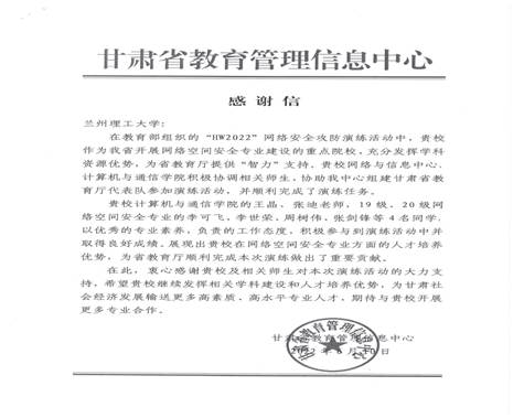 近日,我校收到甘肃省教育管理信息中心感谢信,感谢学校作为我省开展网络空间安全专业建设的重点院校,充分发挥学科资源优势,在教育部组织的“HW2022”网络安全攻防演练活动中,为省教育厅提供“智力”支持,协助省教育厅代表队参加演练活动,取得佳绩,展现出我校在网络空间安全专业方面的人才培养优势,为省教育厅顺利完成本次演练任务做出重要贡献。(撰稿:雷鹏;审核:杨新华)