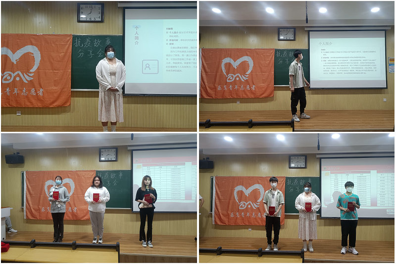 活动邀请疫情期间积极投入校园疫情防控工作中的图提古丽·拉、罗龙飞、付丽梅、孙新栋、陈俊艳志愿者代表发言。分享会上,通过观看抗疫视频,同学们感受到最美逆行者的无私奉献情怀,激励青年学生进一步发扬志愿精神。主持人分享了抗疫英雄赵振东的故事,哪里有危险哪里就会涌现出像他一样千千万万的逆行者,夜以继日默默付出,用实际行动书写疾控一线战士的英雄本色,他值得我们赞美、铭记。接下来优秀志愿者代表依次分享他们的抗疫故事,志愿服务时长287小时的志愿者陈俊燕说:从身边做起就是践行青春使命;参与宿舍抗疫宣传工作的孙新栋说:疫情无情,人间有爱,青年学子理应担当......每一位青年志愿者真挚而热情的发言引起了一阵阵掌声。最后,为优秀志愿者颁发了证书和奖品。
