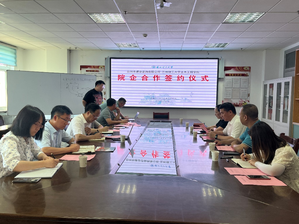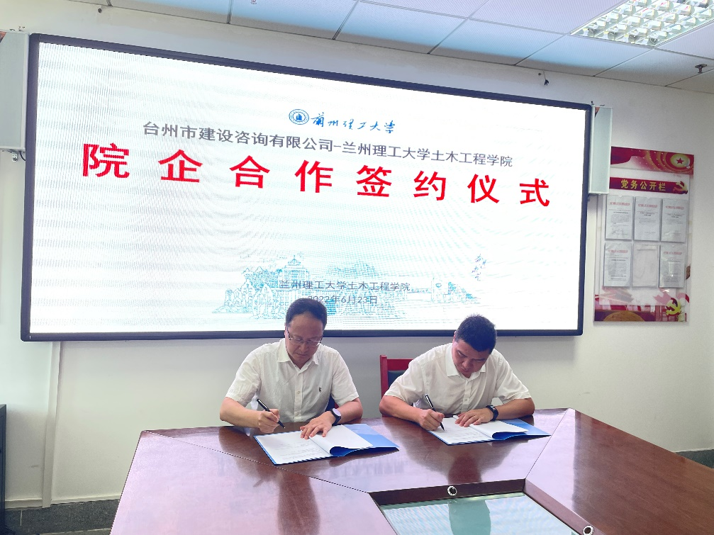 2022年6月23日,兰州理工大学土木工程学院与台州市建设咨询有限公司校企合作签约暨授牌仪式在土木学院会议室举行。台州市建设咨询有限公司总经理杨智勇,人力资源部经理张亚珍、副经理王涵竹,甘肃分公司总经理戴显义,土木工程学院院长王文达教授、副院长殷占忠教授、李万润教授、建筑工程系主任吴长副教授、王永胜副教授,工程管理系主任刘平副教授出席了本次签约仪式。签约仪式由王文达主持。