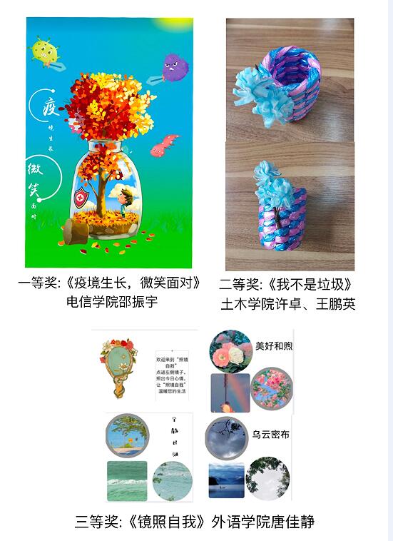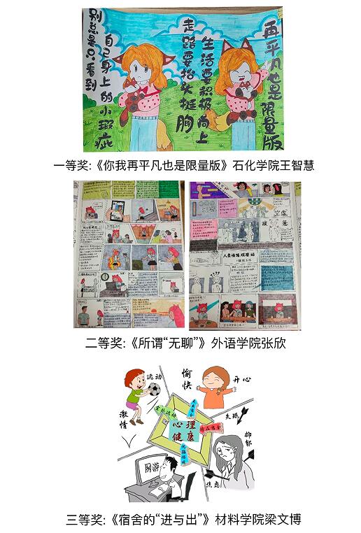 活动发起后,共收到38篇心理征文,23件文化创意产品、32幅心理漫画、36张心理明信片。各种类型的作品良好诠释出“悦纳自我,幸福成长”主题,展现了参赛同学们对心理健康的独特理解和对生活的热爱以及同学们丰富的想象了和创造力,具有较强的启发教育意义。综合考虑作品质量和数量等实际情况,经过严格筛选,最终,心理征文评选出一等奖1名、二等奖2名、三等奖3名、优秀奖3名;文化创意产品评选出一等奖1名、二等奖1名、三等奖1名;心理漫画和心理明信片各评选出一等奖1名、二等奖1名、三等奖1名、优秀奖3名。