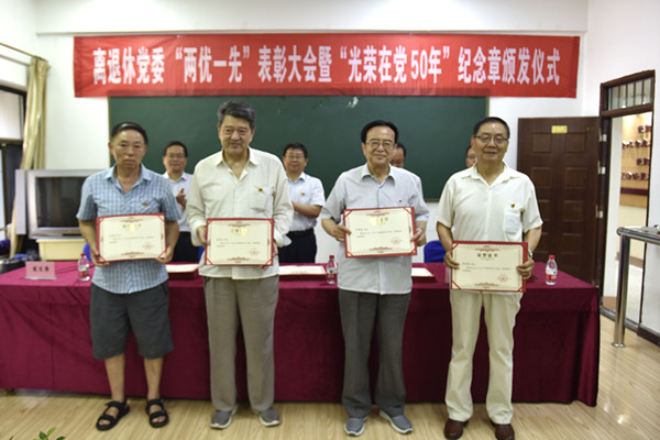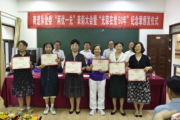 6月30日上午,学校在体育馆二楼老年排练室举行“光荣在党50年”纪念章颁发仪式暨离退休先进集体、先进个人表彰会。学校党委书记夏天东出席会议,离退办主任陈卫雄、组织部副部长李大鹏、荣获“光荣在党50年”纪念章的老党员、2021-2022年度离退休先进集体与个人参加表彰会。会议由离退休党委书记张维权主持。