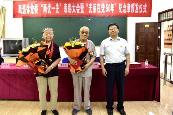 学校党委书记夏天东为荣获“光荣在党50年”纪念章老党员王德昌老师、马玉华老师颁发纪念章