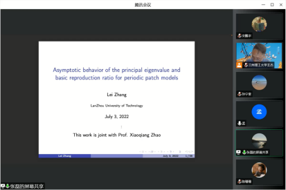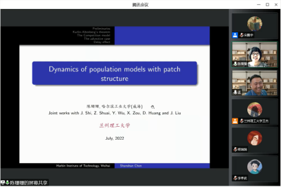 应理学院邀请,哈尔滨工业大学(威海)陈珊珊教授、山东师范大学孙宁奎副教授和哈尔滨工业大学(威海)张磊博士等三位专家7月1日-3日期间与理学院师生开展了线上学术交流,并在7月3日上午分别面向广大师生进行了题目为“Dynamics of population models with patch structure”、“A delay induced nonlocal problem with free boundary”及“On an eigenvalue problem and its application”学术报告,会议由孟新友教授主持,学院部分青年教师和研究生30余人参加了报告会。