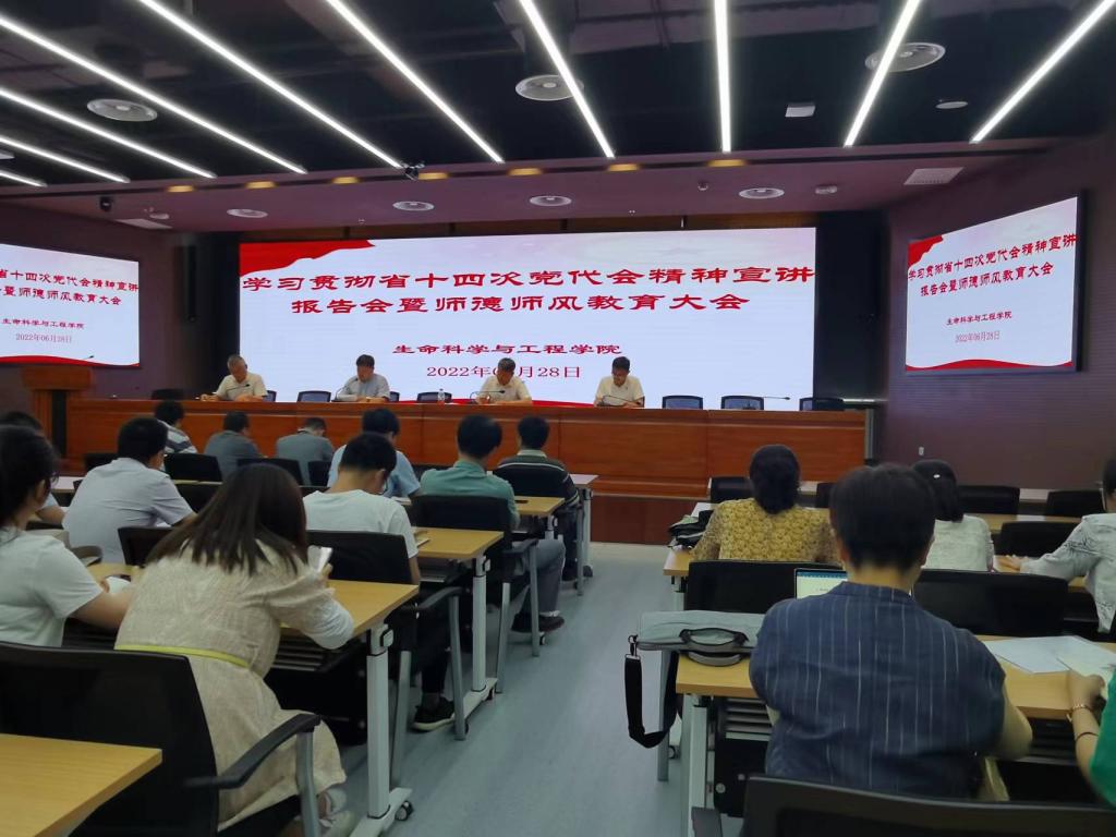 6月28日下午,生命学院学习贯彻省十四次党代会宣讲报告会暨师德师风教育大会在彭家坪校区图书馆109报告厅举行,学院全体教师参会,会议由学院党委书记穆龙主持。