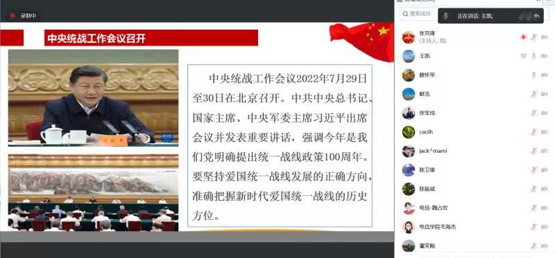 王凯博士以《开创新时代统一战线工作新局面》为题,从百年统战历史性贡献、统战工作新理念新思想新战略、新时代统战工作历史方位和做好统战工作的任务、重点、要求等四个方面,详细解读了习近平总书记在中央统战工作会议上的重要讲话精神。他认为,做好新时代高校统战工作要以习近平总书记关于做好新时代党的统一战线工作的重要思想为指导,加强党外知识分子思想政治引领,广交深交朋友,进一步增进统一战线共识。报告具有很强的概括性和实践性,为我们做好新时代高校统一战线工作提供了帮助。