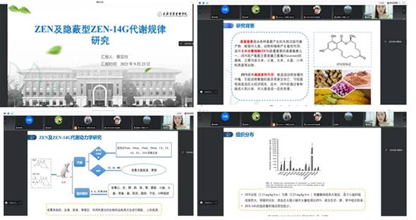 在上海农科院联培的蔡亚玲对“ZEN及隐蔽型ZEN-14G代谢规律研究”进展娓娓道来。详细介绍了ZEN(玉米赤霉烯酮)的研究背景、“毒代动力学”“生物样品检测方法的建立”“ZEN及ZEN-14G代谢动力学”的研究结果和拟进一步开展的工作。研究发现:对小鼠进行ZEN灌胃试验之后,在其血液、尿液、粪便以及肝、肾、肺等14个脏器中均能检测到不同浓度的ZEN及其代谢物ZEN-14G的存在。该研究为不同毒素在生物体内的代谢动力学研究提供了数据支撑。