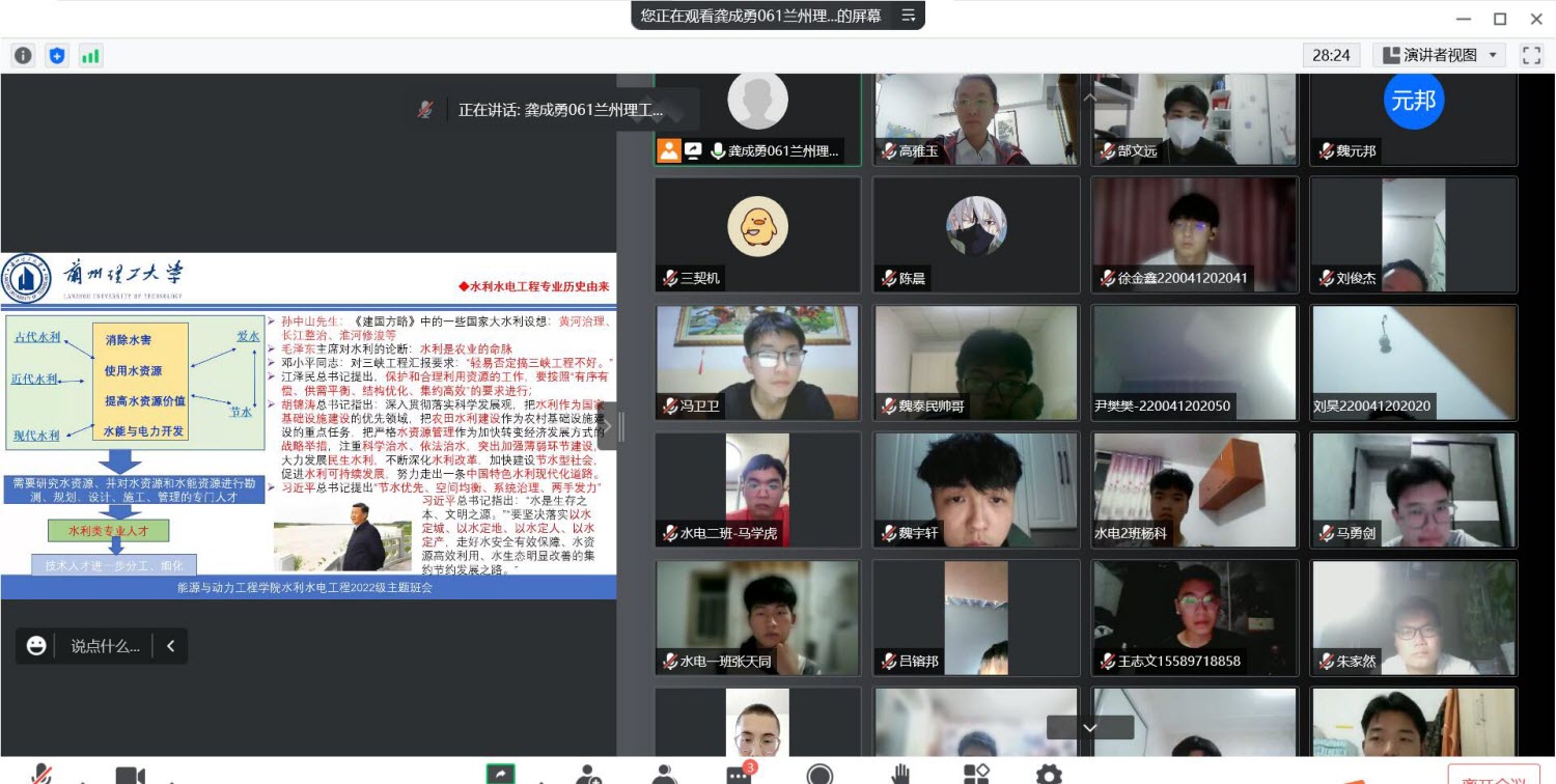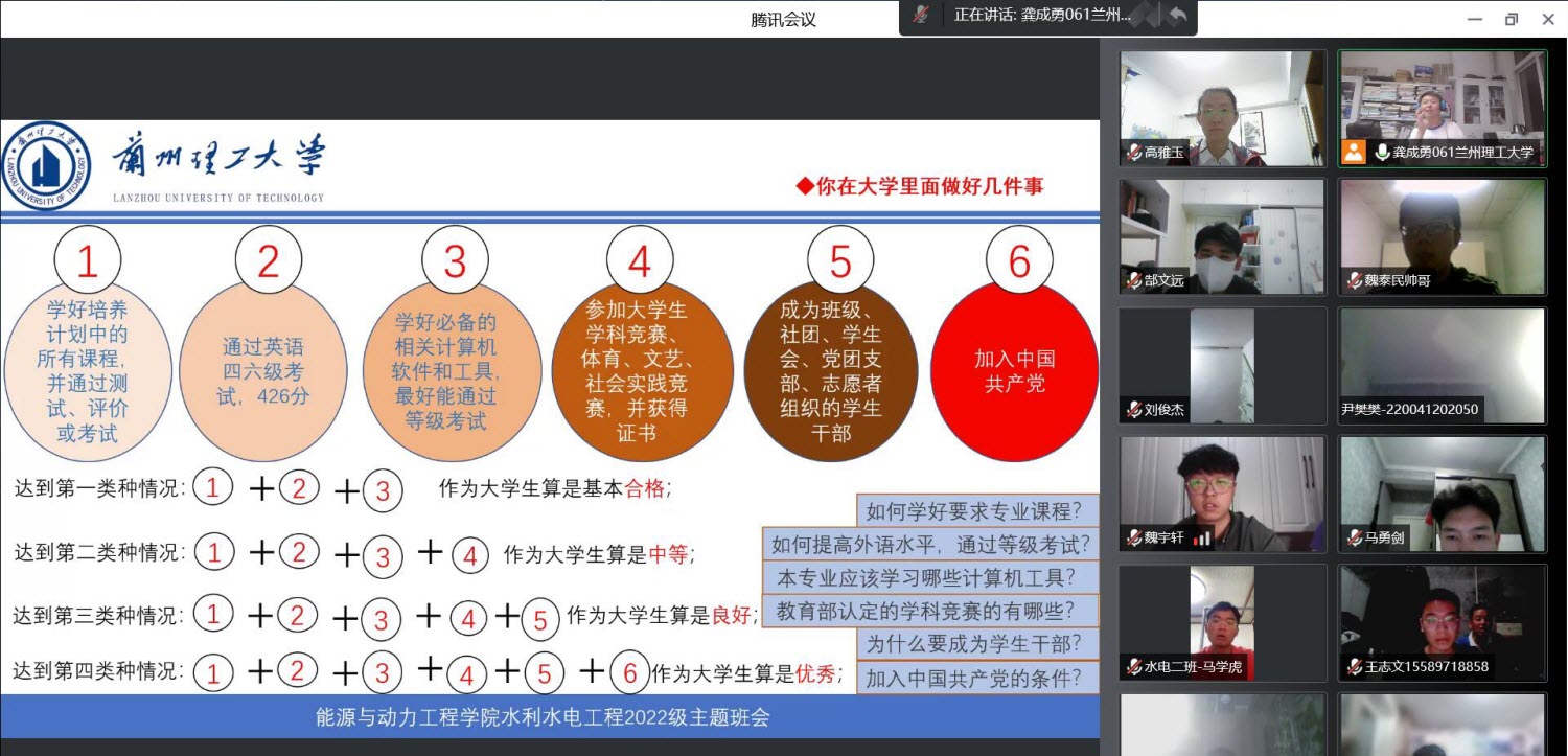 记2022年9月3日——新生入学教育班会:20:00通过腾讯会议的形式,主题班会分为两个阶段,第一阶段2022级水利水电工程1、2班合并一起进行,第二阶段分班开展。第一阶段的主题为:兰州理工大学助力青年“成长、成才、成就”,由龚成勇老师主讲。主要内容包括学校学院专业历史沿革与介绍、高等教育与学习的特点、大学学习方法启迪——专业培养方案解读、大学职业规划重点——做好几件事、大学也需要注意——大学学习生活误区、立德树人要求下得的期望。参加大会的除了两个班的全体同学,还有新同学家长、2022级水利水电工程2班班主任高雅玉老师。龚老师讲述结束后与同学们互动并回答大家提出的问题,这一阶段历时2个半小时;通过院系介绍使学生进一步了解学校专业,培养爱学校的荣誉感,构建专业自豪感。通过水利水电工程专业培养方案解读,帮助新生初步理清大学专业人才培养的脉络,有利于帮助他们对大学各方面进行规划做准备;“大学职业规划重点——做好几件事和大学也需要注意——大学学习生活误区”等两个环节帮助新同学消除入学前的顾虑,并集中回答同学们关注或疑问,进而帮助新生完成入学思考和初步规划,激发新生对大学时期学习梦想和对大学生活美好的向往,同时也做好由于疫情的影响的心理疏导。第一阶段的入学教育内容极大的鼓舞了新同学,纷纷表示入学教学的主题班会非常有价值,龚成勇老师最后向2022级水利水电工程专业新同学倡导:作为新时代有为青年,应该主动担起历史的使命,迎接时代的挑战、抓住发展机会,借助人类进步、社会发展和国家建设的趋势,配合好学校学院专业及教师的立德树人的中心工作,把自己培养成为祖国精英和栋梁,把2022级水利水电工程两个班建设成为精英班级。第二阶段主要任务是班主任与辅导员老师一起听取竞选班级临时负责人发言,初步选定班级工作的负责人,并对在线网课、班级管理、尤其疫情防控与安全、学生心理等内容进行了梳理与说明,最后给当选临时负责人同学安排工作,并各项工作进行指导说明。
