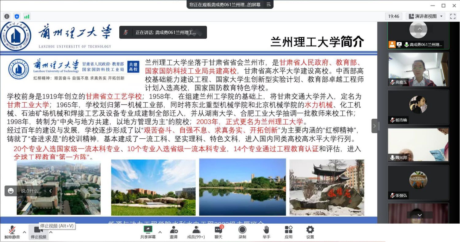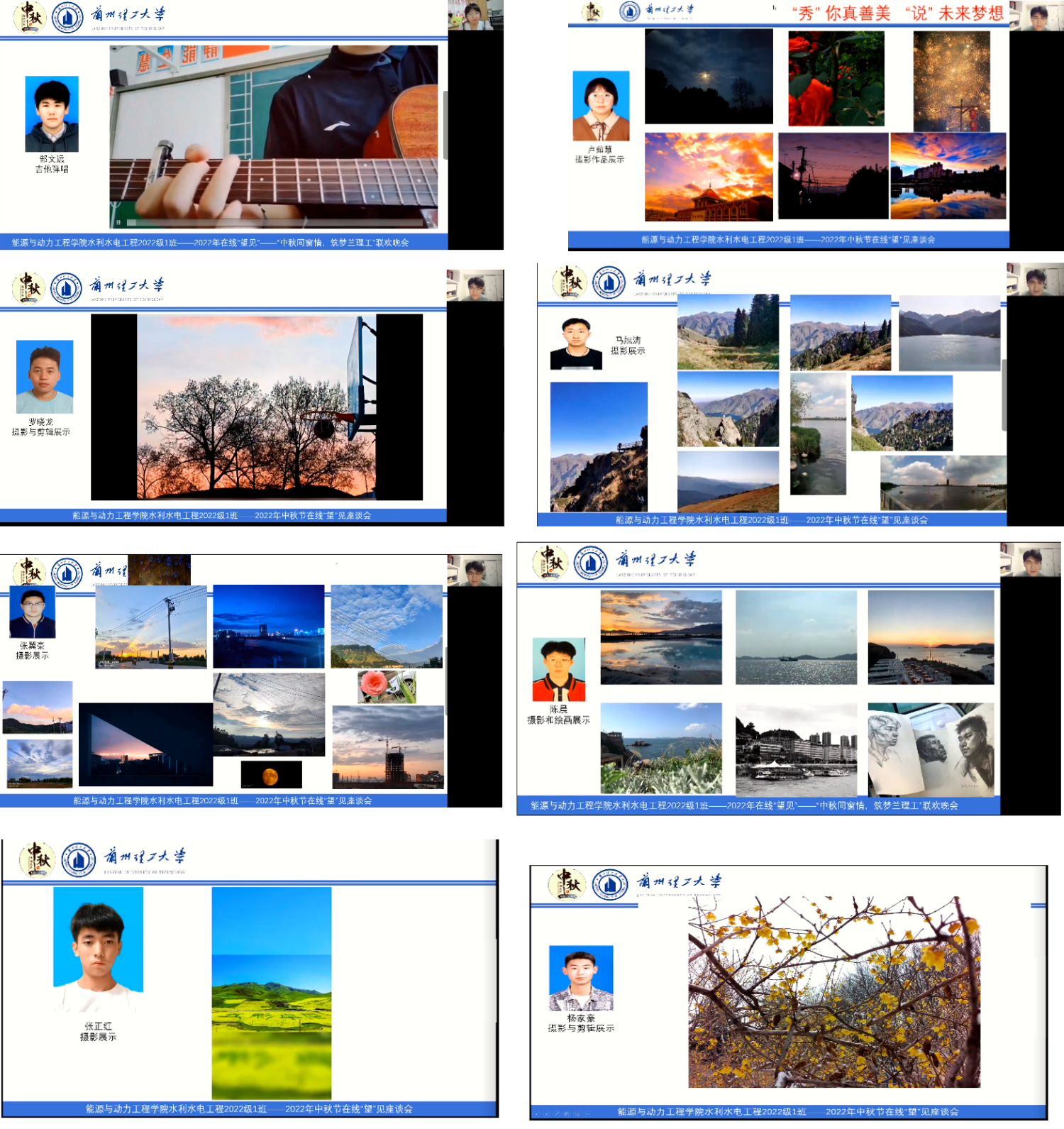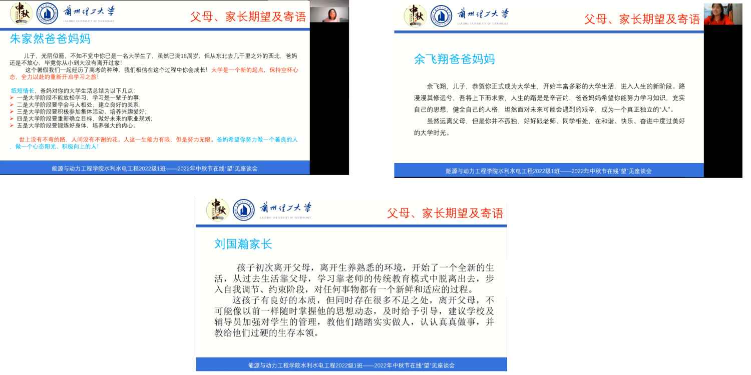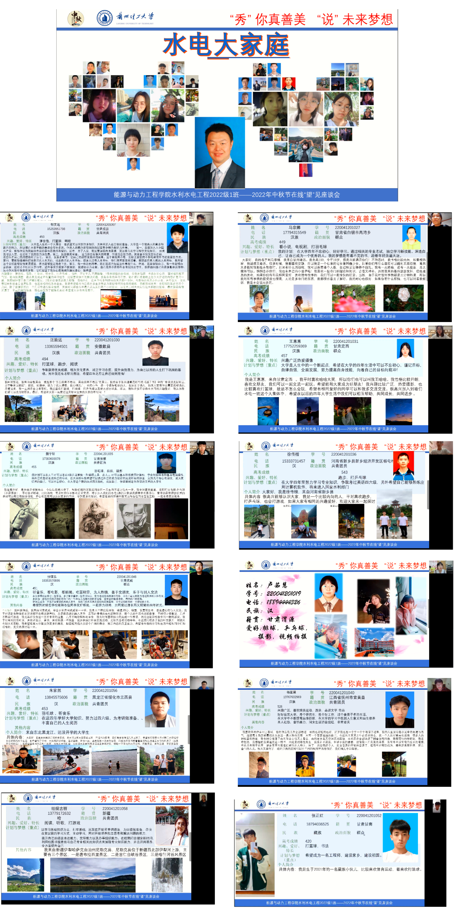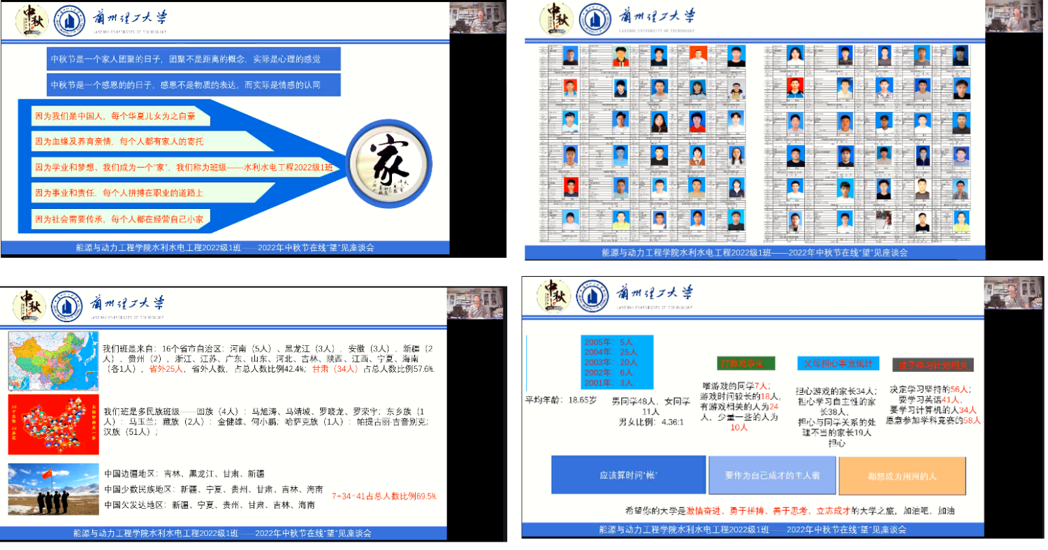 记2022年9月10日——“月满中秋 兰理相望——中秋同窗情,筑梦兰理工”水利水电工程1班家族“云”见面会。该班会主题是:以“网”相连,“云”中相见,实现“中秋同窗情,筑梦兰理工”,开启激情奋进、勇于拼搏、属于思考、立志成才的大学之旅。以腾讯会议的形式召开网上座谈会,活动由班主任龚成勇老师、副班主任张辉和中秋活动筹备小组共同完成。活动于20:00正式开始,由本班新生郜文远和卢茹慧主持。参加活动包括班主任、副班主任和全体新生及家长。活动主要包括宣读活动主题、奏唱中华人民共和国国歌、班主任和家长代表寄语、新同学自我简介——“秀”你真善美 “说”未来梦想、新生代表才艺大放送、宿舍集体照片墙展示集体团结、畅谈中秋送祝福等内容,活动历时2个半小时,其中班主任老师寄语时强调国家、民族、家庭、班级、宿舍这些现实中存在“家”形式和意义,也提出了新同学未来规划中行业、专业、职业所引导同学们成长成才的“家”的责任与义务,同时分享了班级学生生源地、民族学生、地域文化等基本信息,并结合前期问卷调查结果展示学生现状与梦想和父母的期望与忧虑;活动中邀请来自黑龙江的朱家然同学的父母、安徽省的余飞翔父母和甘肃省武威的刘国瀚父母在线给同学们寄语,情感真挚,不仅对考上大学的孩子们表示祝贺,还表达了对孩子们对游戏、陋习等所产生的诱惑影响孩子的学习和生活的担心顾虑,也都指出自己的建议,同时对孩子们提出了美好的祝源;新同学自我简介环节每位同学出镜做介绍,占用了大量的时间,同学们均表达了有幸加入这个班集体,今年能进入兰州理工大学是美梦成真,并结合自己的兴趣爱好对自己大学做了规划,多数同学对大学充满了期待,也准备努力拼搏,立志成才,有些同学具体说了自己的学习计划和目标;活动筹备组征集8名同学的才艺项目(主要受限于在线现实的条件制约),并制作了精美的PPT及短视频,展示新一代大学生具备能战胜好生活学习的困难和对美好大学生活的热爱与期盼;活动筹备组编制的宿舍集体照片墙展示集体团结和畅谈中秋送祝福两部分内容主要为营造中秋节日气氛,同时展示同学们进入新学校的兴奋,表达了新时期大学生对大学生活与学习的期盼。