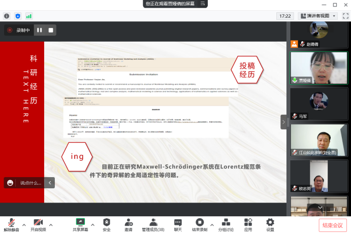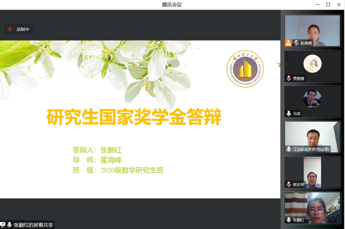 为进一步规范国家奖学金评审工作,充分发挥其学风引领作用,促进我院学风建设,2022年9月26日16:30,兰州理工大学理学院通过腾讯会议召开了2022年度研究生国家奖学金答辩会议。本次会议由马军副院长主持,由十位教师担任评审领导小组,并有一百多名研究生参会旁听。
