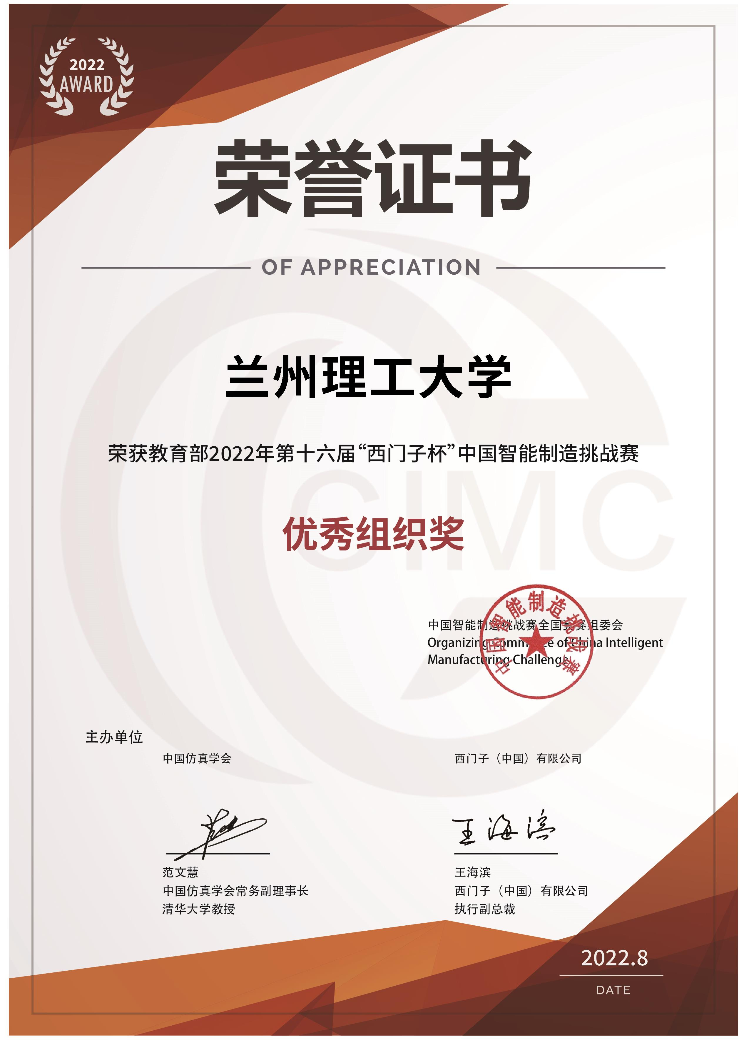 2022年挑战赛信息化网络化方向合计有156个学校615支队伍报名参赛。经过分赛区的激烈比拼,评选出39支优秀队伍参加了全国总决赛,我校获奖队作为西部三赛区唯一一支特等奖赛队晋级全国决赛队伍,最终在本科队伍中以总分82.8分的成绩夺得全国一等奖。同时由于我校成功承办了本届挑战赛(信息化网络化方向)甘肃赛区竞赛工作,刘朝荣和冯小林两位老师受聘组委会完成了挑战赛信息化网络化方向和离散行业运动控制方向全国初赛的技术评审工作,被组委会授予优秀组织奖荣誉。