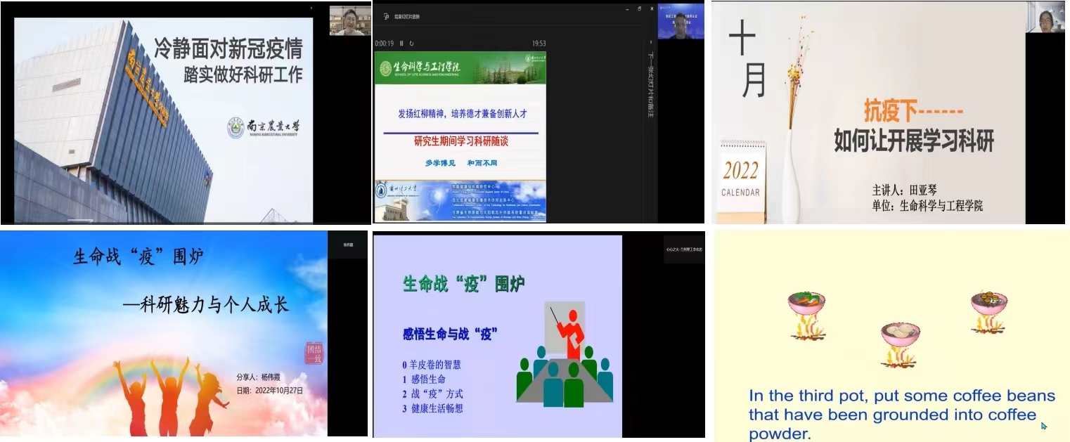 秋季学期开学以来,新冠疫情打破了正常的上课和学习秩序,云端授课的形式给同学们带来了或多或少的焦虑感。为引导疫情期间学生愉快地开展学习、科研工作并健康成长,10月27日晚,生命战“疫”围炉开讲。腾讯会议特邀南京农业大学2019级博士研究生陈鑫(我校2013级食品科学与工程专业学生)、学院近两年引进的田亚琴和杨伟霞两位博士分享了科研魅力与个人成长体验;李志忠教授做了《感悟生命与战“疫”》的讲座。生命科学与工程学院学院副院长、生物资源开发与环境健康创新研究团队负责人任海伟教授主持讲座。团队导师制本科生、研究生及部分教师67人在线参会。
