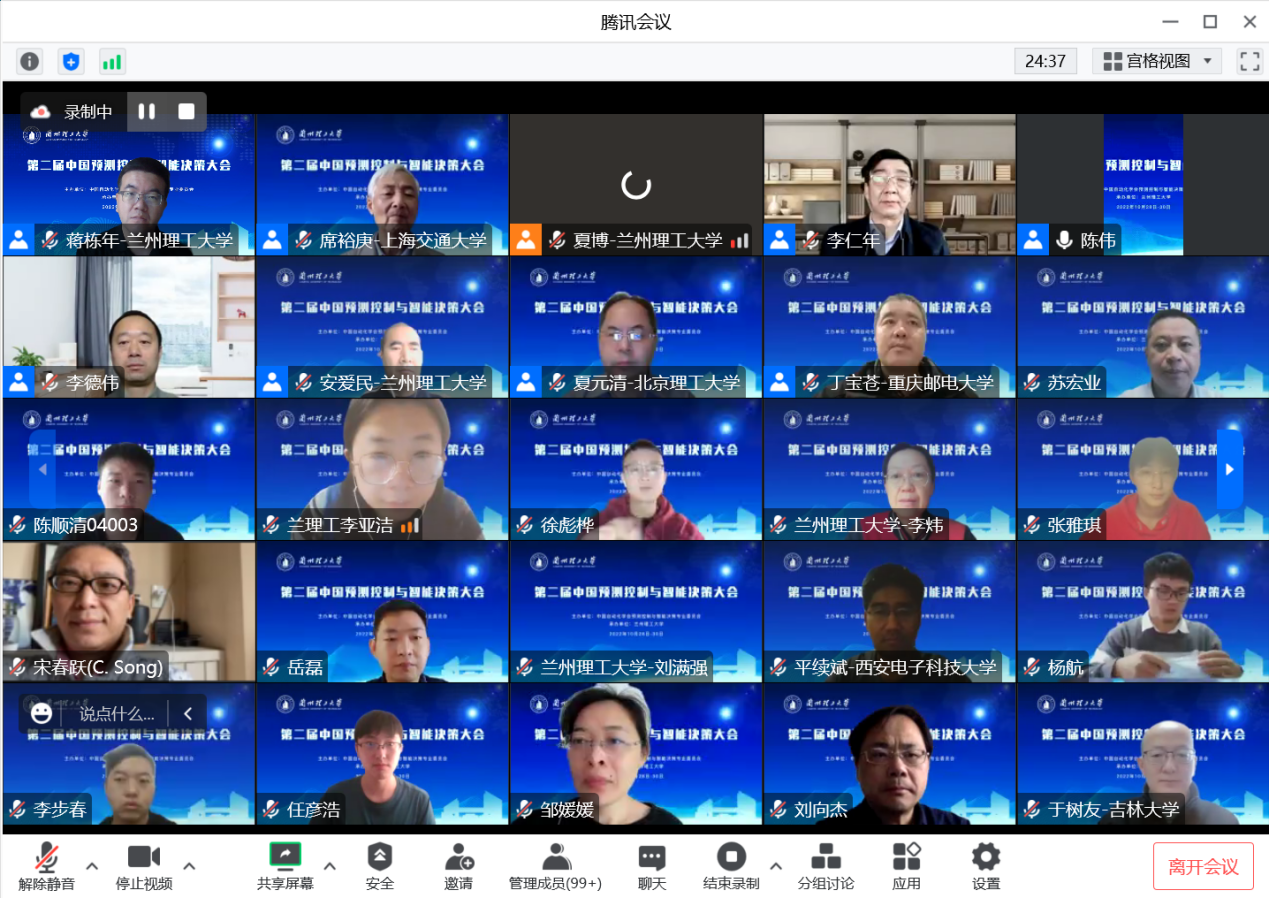 10月29日至30日,由中国自动化学会和中国自动化学会预测控制与智能决策专业委员会主办,我校电信学院承办的“第二届中国预测控制与智能决策大会” 通过腾讯会议的形式在线召开。中国自动化学会第七、第八、第九届理事会副理事长席裕庚教授、预测控制与智能决策专业委员会主任委员李德伟教授,我校李仁年副校长、电信学院院长陈伟以及来自全国高等院校、科研院所和企业的近700名专家学者和青年学生参加了会议。会议由大会报告、青年专家专题报告和评奖论文报告组成,李德伟教授和陈伟教授担任大会主席,华北电力大学刘向杰教授担任大会报告主席。