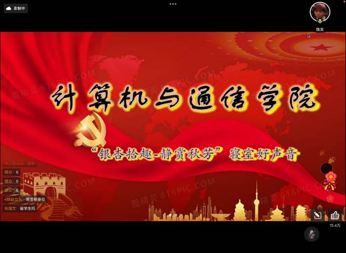 10月30日晚,计算机与通信学院团委组织开展了“银杏拾趣 静赏秋芳”之“寝室好声音”线上活动。同学们用歌声、用才艺展示自己的青春风采,分享寝室生活、青春旋律,守护友情、传递真情、释放正能量,共同守护校园这片净土。尤其是22级新生积极踊跃参加,许多老师也被同学们精彩的表演所吸引。原定一个半小时的活动延长了一个多小时,同学们还意犹未尽。