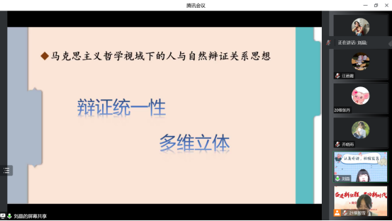 汪莙霞和刘晶老师分别围绕《“两个结合”开创理论创新新格局》《“基于‘推动绿色发展,促进人与自然和谐共生’背景下人与自然辩证关系的思考”》进行了宣讲。两位老师通过详细讲解了“两个结合”——把马克思主义基本原理同中国具体实际相结合、同中华优秀传统文化相结合——的必要性和重要性,以及如何实现“两个结合”的路径,看待人与自然辩证统一这一问题的看法,从恩格斯《自然辩证法》的一段原文和两位西方学者的观点入手,讲解了有关生态经济学的内容,宣讲有理有据、赋有特色。