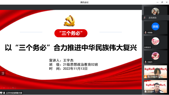 学院祁琪格、王宇杰、吴晓丹、郝志军、郭瑜聪5位2021级研究生为大家做了示范性宣讲,主要围绕大会背景、主题、报告结构与主要内容等方面进行了宣讲。通过此次“微党课”活动,让同学们更加深刻地理解了党的二十大报告的主要内容和会议精神。