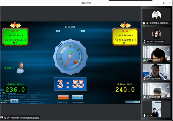 为了丰富学生的宿舍生活,理学院团委于11月5日至17日在腾讯会议平台举办了辩论赛,此次比赛由窦一菡、程星亮主持,第十六届主席团成员以及理学院辩论队负责人范璐婷出席并担任本次比赛的评委。本次辩论赛共有10支队伍参赛,经过初赛的选拔,有4支队伍进入决赛。