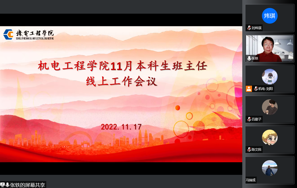 为进一步有序推进各项重点工作,11月17日晚,机电工程学院召开11月本科生班主任线上工作会议.全体班主任、辅导员参加,学院党委副书记张轶主持会议。