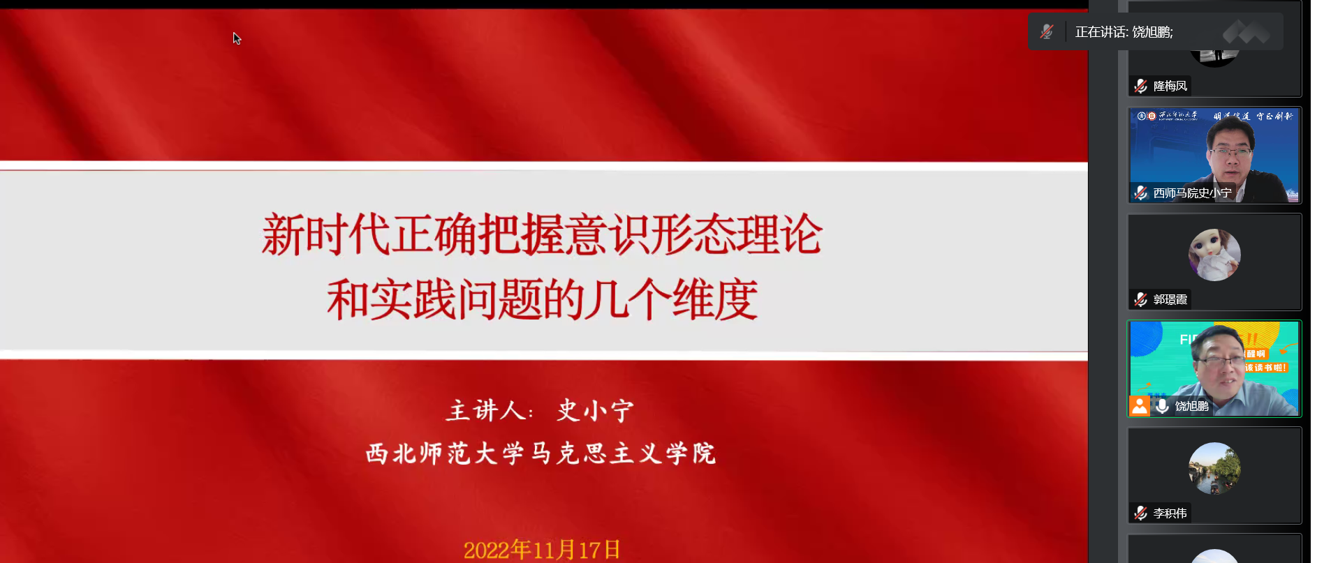 为进一步引导学院师生增强“四个意识”、坚定“四个自信”、做到“两个维护”,深入理解、贯彻落实党的二十大精神,11月17日下午,马克思主义学院特邀西北师范大学马克思主义学院院长、博士生导师史小宁教授作题为“新时代正确把握意识形态理论和实践问题的几个维度”的线上专题报告。会议由学院院长饶旭鹏教授主持,学院全体师生参加了会议。