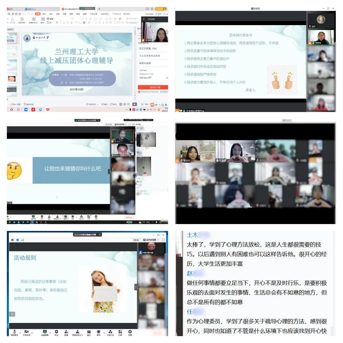 值得一提的是,线上减压团体辅导鼓励同学们在团体中彼此分享和支持,利用团体动力帮助同学们缓解压力,截止目前共开展场线上减压团体22场,共计约300名同学参与,线上减压团体得到参与同学的积极反馈。
