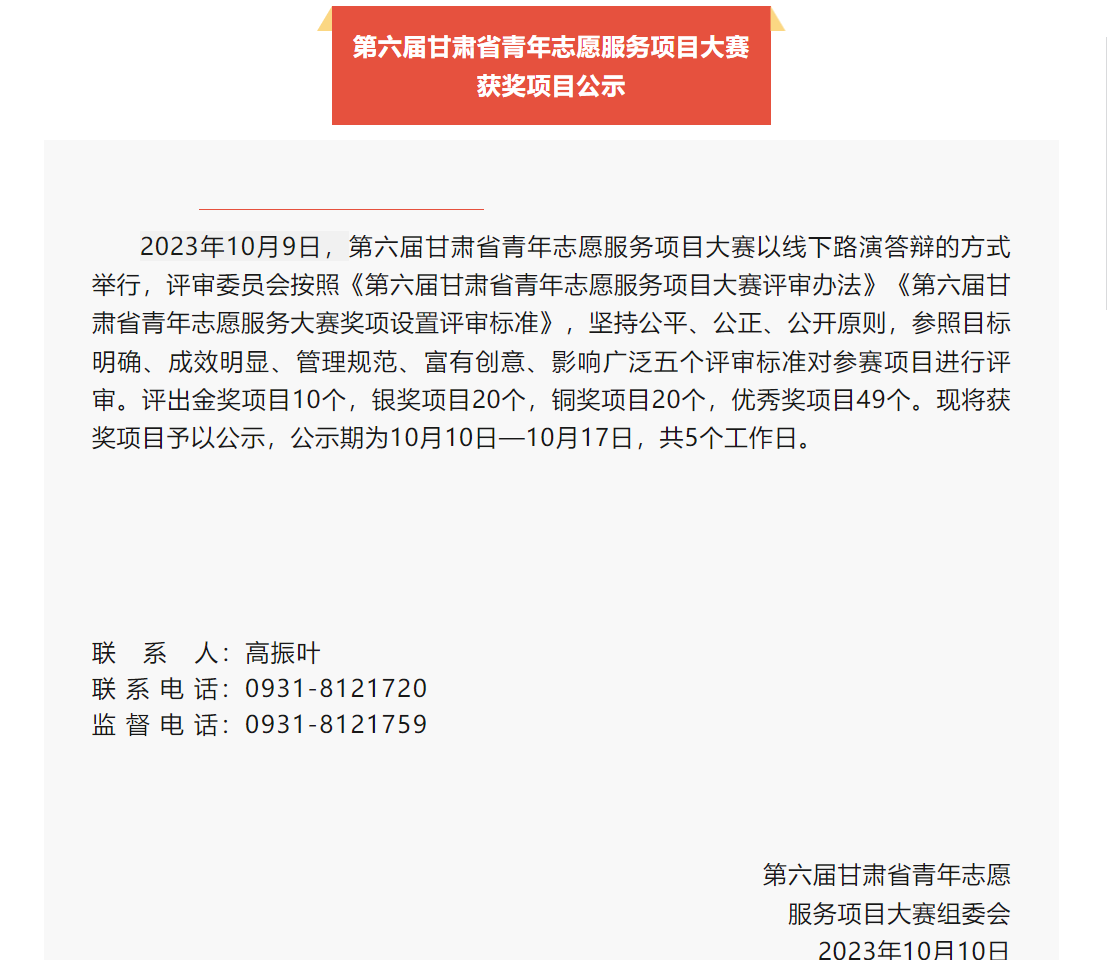 近日,由团省委、省文明办、省民政厅、省司法厅、省生态环境厅、省水利厅、省文化和旅游厅、省乡村振兴局、省卫生健康委、省残联主办的第六届甘肃省青年志愿服务项目大赛决赛圆满结束。机电学院志愿服务项目《兰州学子百村行》《传承非遗脊兽技艺,助力乡村振兴》《甘肃省传统武术文化传承与推广》荣获奖项。