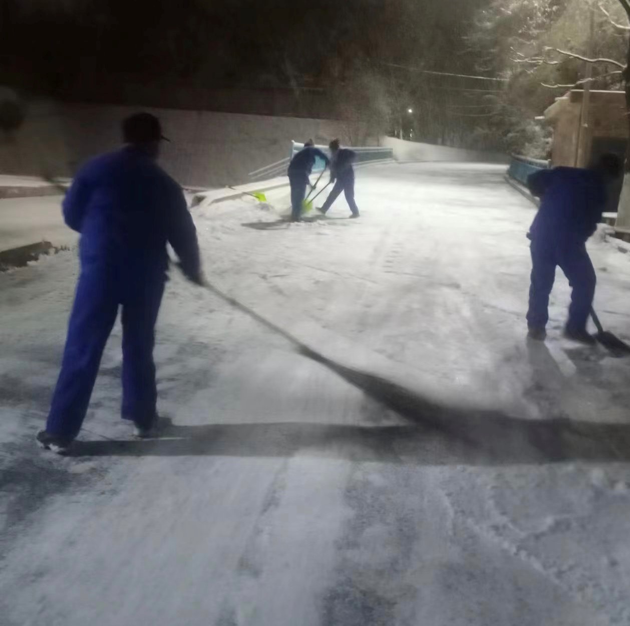 清晨天未亮,工作人员带着各自的扫雪工具,踏着积雪,不畏严寒,挥舞着手上的铁锹,优先将家属区、校区各主干道积雪清除,很快就为家属区和校园清扫出了一条条“平安路”。为保障甲子坪上下山路段方便出行,绿化班组快速响应,大家分工合作、默契配合,有序清理山路积雪。