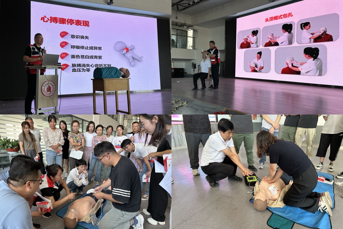 培训中,主讲老师薄文杰通过理论讲解、现场演示、实践操作等方式,结合人体模型、急救用具和鲜活案例,全面讲解了救护概论、应急救护“黄金四分钟”、心肺复苏(CPR)、气道异物梗阻处理、止血、包扎、创伤救护等方面的急救理论与施救技巧,在现场演示了心肺复苏、自动体外除颤器(AED)、绷带、三角巾包扎等急救方法。培训教师以小组形式利用人体模型和急救用具对每名参训老师进行实操,过程中培训老师悉心指导、纠正动作,切实帮助参训老师掌握救护技巧和方法,并对参训老师进行了逐项考核。
